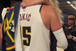铁汉柔情!掘金G1赢森林狼赛后约基奇抱起女儿返回更衣室