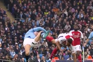 恐怖冲击力!曼城官推:哈兰德两次撞翻阿森纳球员