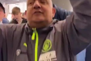 曼城球迷“水瓶哥”赛后狂欢!手持阿森纳水瓶比划“枪手落泪”